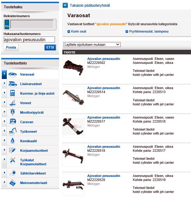 Kahan koko Metzger-ajovalojen pesusuutinvalikoima löytyy Autoluettelosta hakusanalla ”ajovalon pesusuutin”. Ajoneuvokohtaisesti sopivat suuttimet löytyvät rekisterinumerohaun avulla ”Korin osat”- ja ”Pyyhkimensulat, lasinpesu” -osioista.